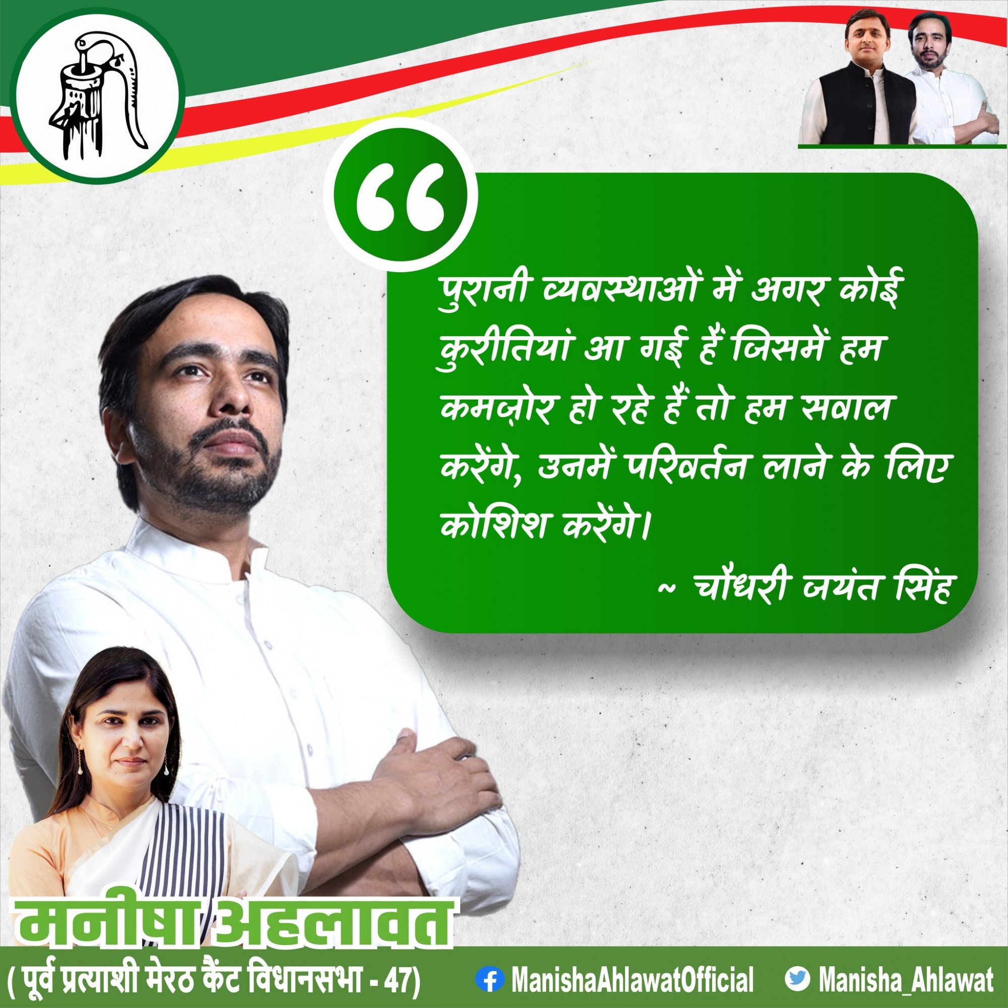 सामाजिक न्याय की दिशा में परंपरागत ढाँचे में भी परिवर्तन लाना पड़े तो राष्ट्रीय लोक दल कभी पीछे नहीं रहा, चाहे वह चौधरी चरण सिंह जी का नेतृत्व हो या चौधरी जयंत सिंह जी का।